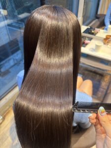 これは、健康な髪と同じ弱酸性の薬剤を使って、髪への負担を抑えながら自然なストレートヘアに仕上げる技術なんです。